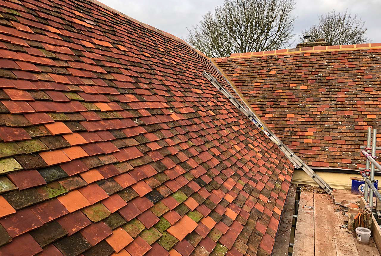 The roof at The Maltings has needed extensive repairs throughout - many of the main timbers had extensive rot and were sagging in places. Below the tiles, no felt or membrane had been fitted. All the tiles have been removed, and the rotten timbers have been either repaired, strengthened or replaced. Where possible the original tiles have been reused, great care has gone into matching the original tiles where replacements are needed.